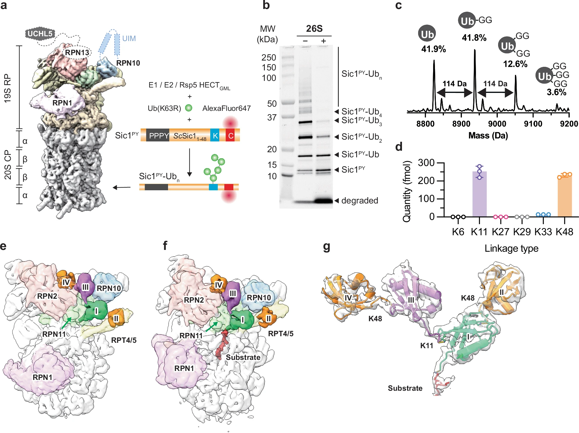 研究團隊結合冷凍電子顯微鏡(cryo-EM),絕對量化質譜泛素化分析(Ub-AQUA)和交聯質譜(XL-MS),解析出人類 26S 蛋白酶體與分支型 K11/K48 連結泛素鏈結合的結構,揭開蛋白酶體如何以分子等級的精度「讀取」這些複雜降解訊號的機制。